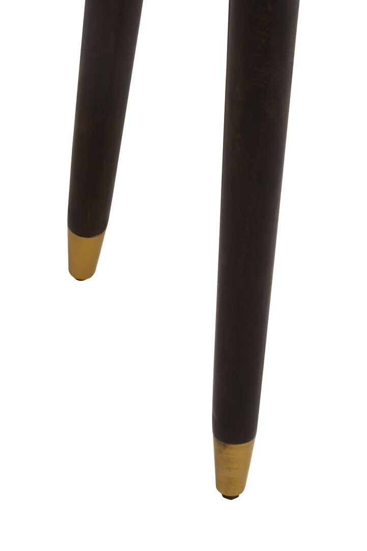 Brown mango wood console table, with gold top legs and rectangular top with geometric gold lines.
